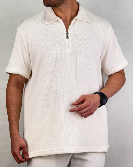 پلوشرت مردانه راه راه نیم زیپ لینن رنگ سفید کد 69902