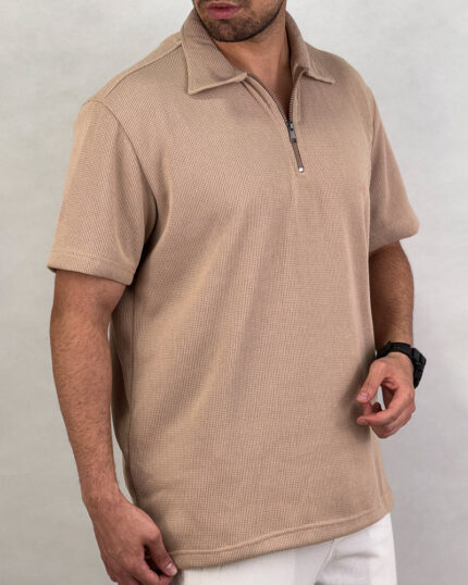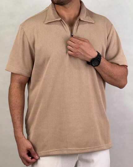 پلوشرت مردانه راه راه نیم زیپ لینن رنگ کرم کد 69903
