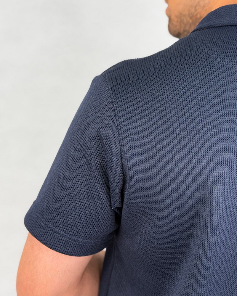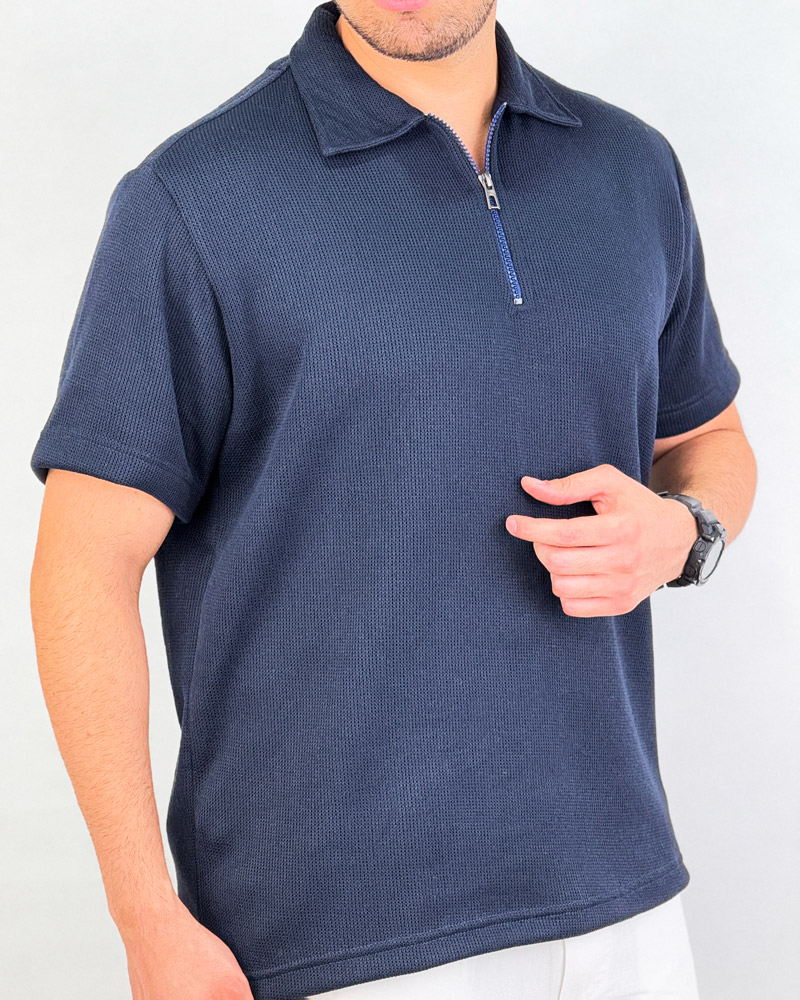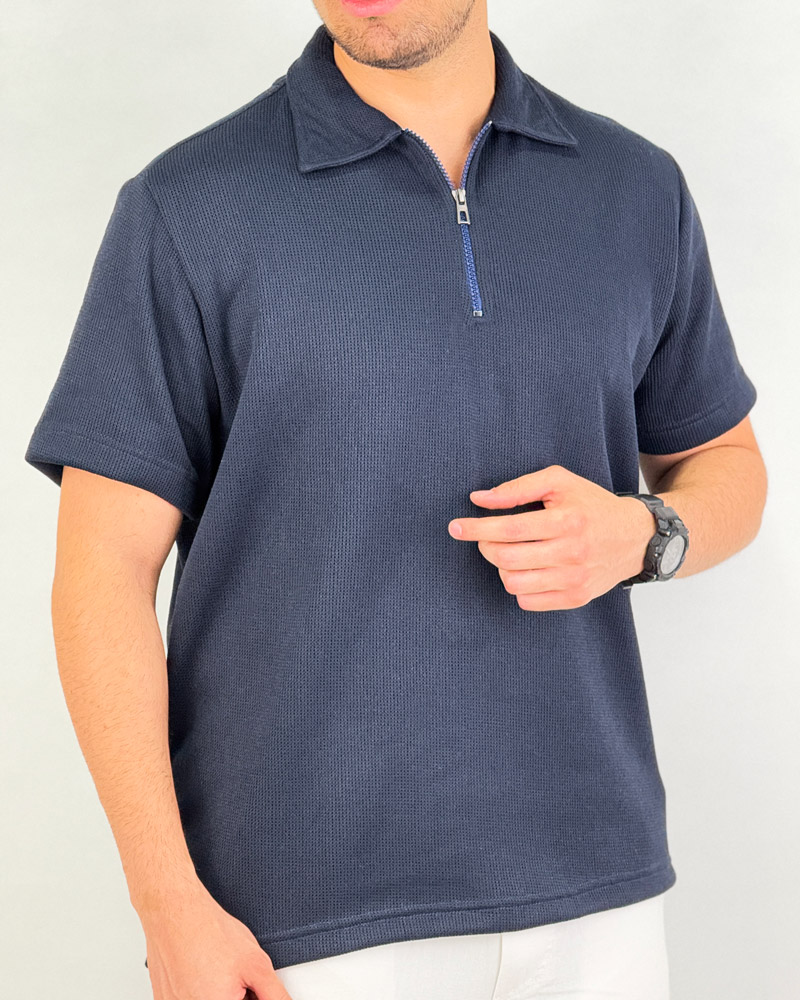 خانه تیشرت مردانه پلوشرت مردانه راه راه نیم زیپ لینن رنگ سرمه ای کد 69901