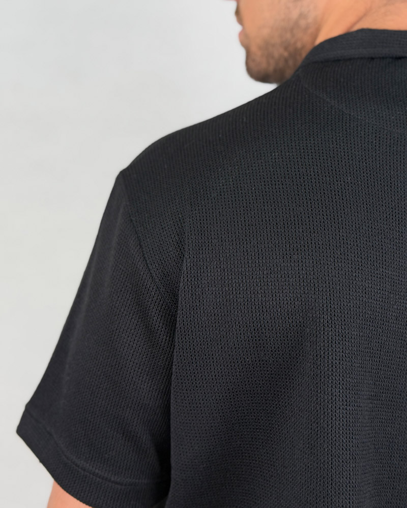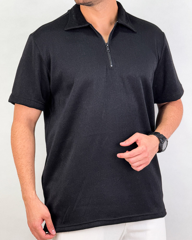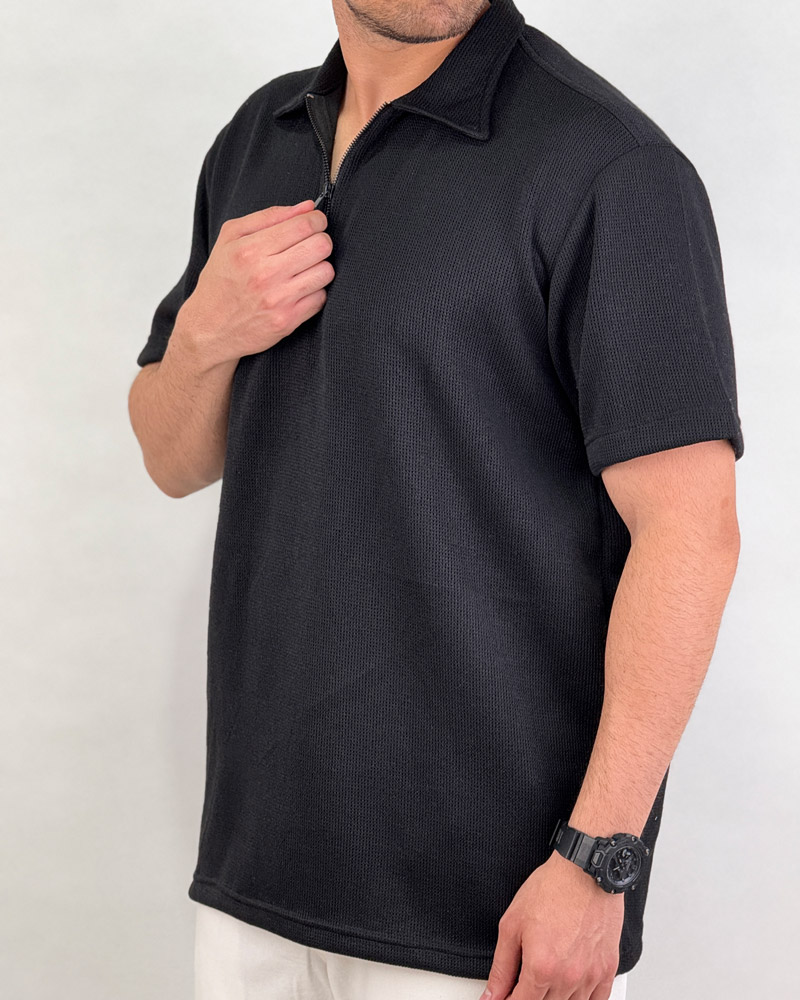 خانه تیشرت مردانه پلوشرت مردانه راه راه نیم زیپ لینن رنگ مشکی کد 69900