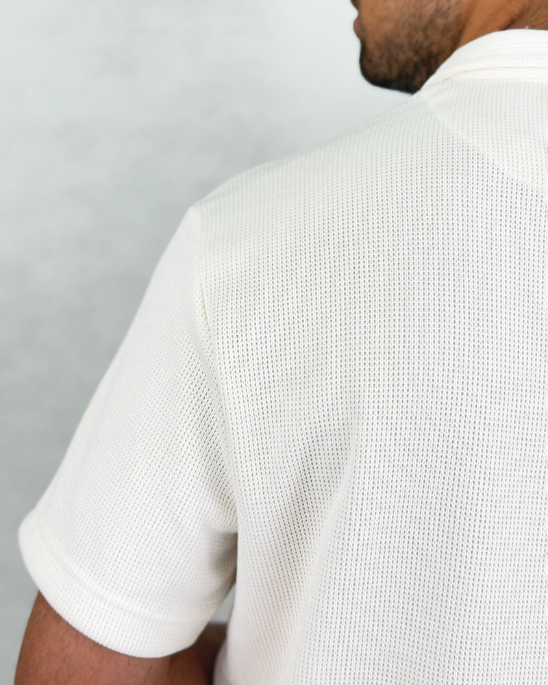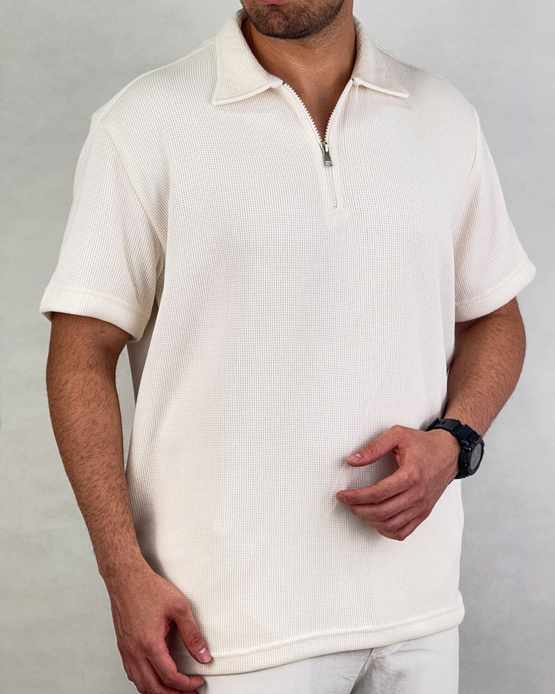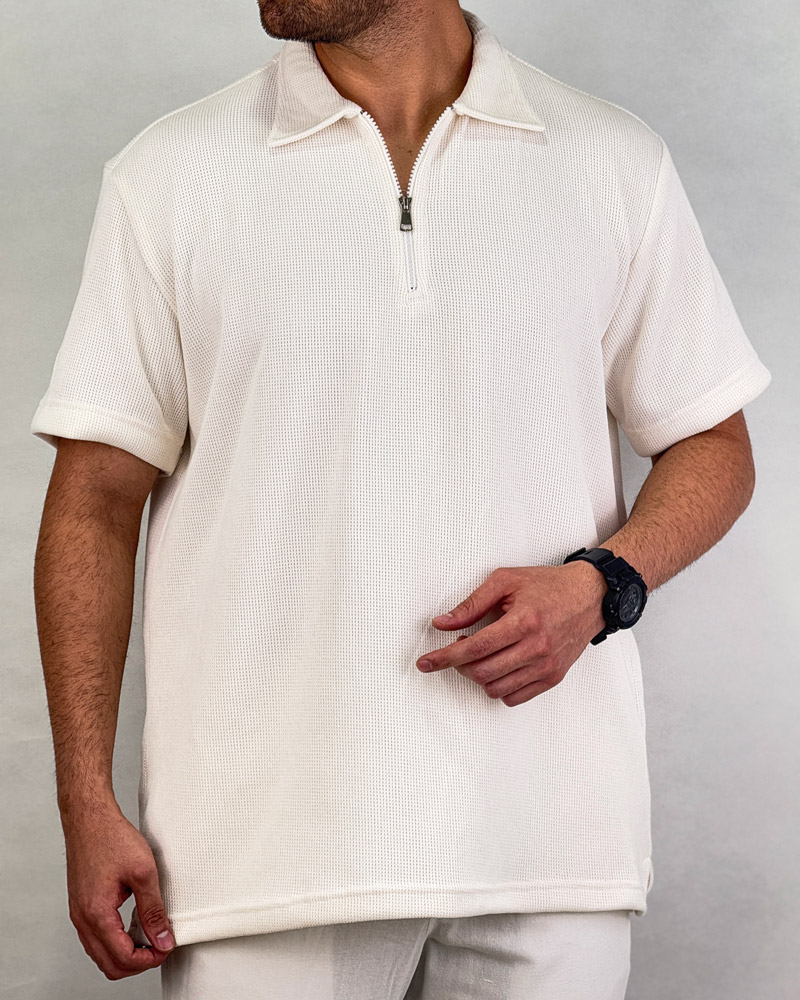 خانه تیشرت مردانه پلوشرت مردانه راه راه نیم زیپ لینن رنگ سفید کد 69902