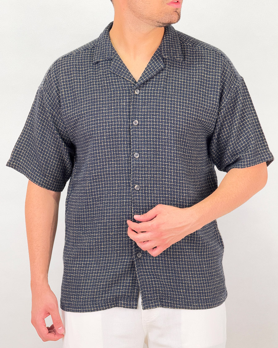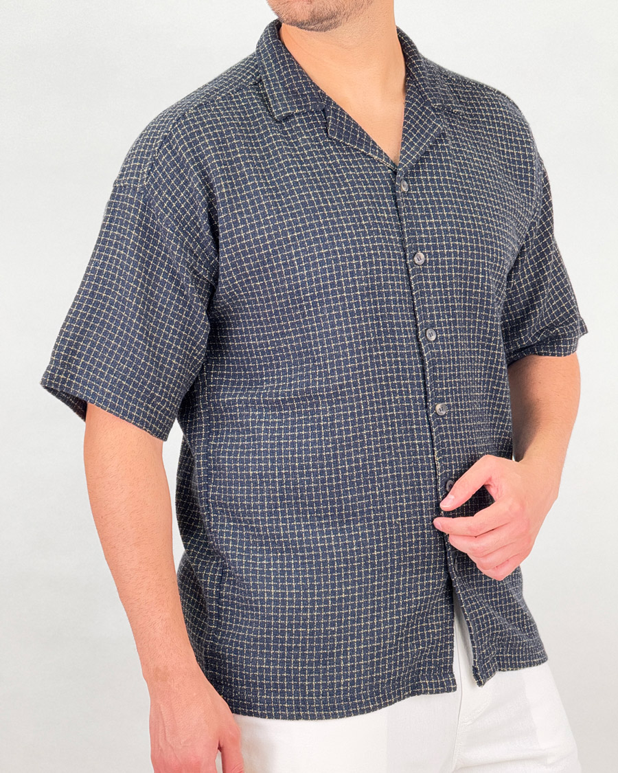 پیراهن مردانه لینن بیسکوییتی مدل هاوایی انگلیسی رنگ سرمه‌ای کد 30009
